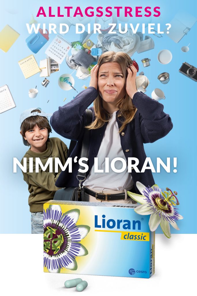 Lioran® classic für Nacht und Tag die Passionsblume. Wirkstoff: Passionsblumenkraut-Trockenextrakt. Traditionelles pflanzliches Arzneimittel zur Besserung des Befindens bei nervlicher Belastung und zur Unterstützung des Schlafes ausschließlich auf Grund langjähriger Anwendung. Enthält Lactose. (Stand: 04/2025) Zu Risiken und Nebenwirkungen lesen Sie die Packungsbeilage und fragen Sie Ihre Ärztin, Ihren Arzt oder in Ihrer Apotheke. Cesra Arzneimittel GmbH & Co. KG, Flugstraße 11, 76532 Baden-Baden